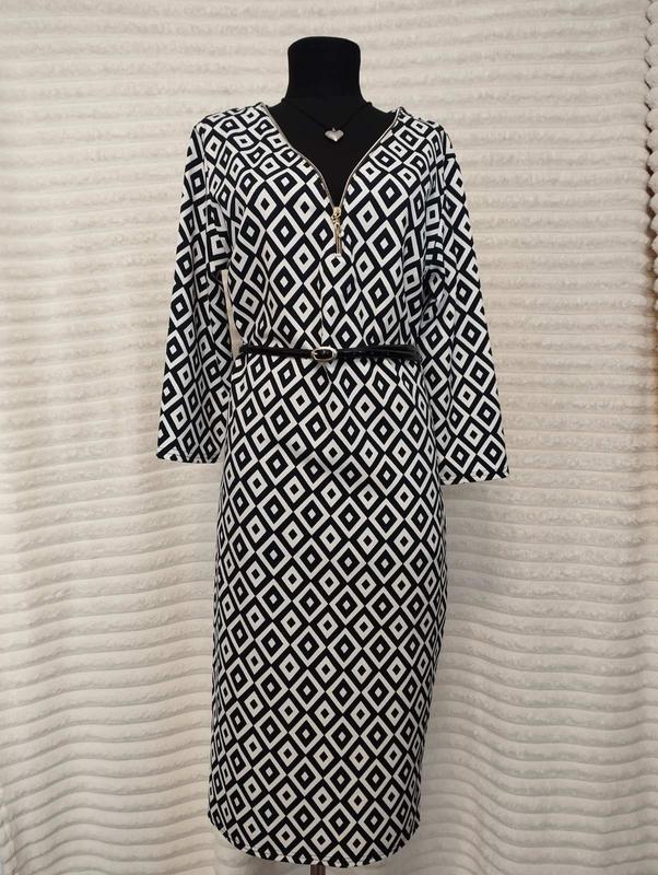 Платье в идеальном состоянии. Без карманов и без подкладки. Бирка срезана. Заміри на фото. Платье хорошо тянется. Рукав 3⁄4. Талия до 88 см. Бедра до 102 см. Длина платья по спинке – 100-103 см
