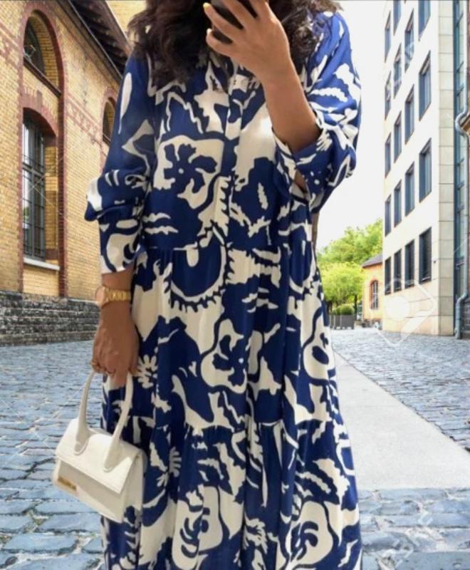 Платье из вискозной ткани. Воротник, скрытые пуговицы сверху и длинные рукава реглан с пуговицами на манжетах. Слегка расклешенная юбка со складнями. Размер M от подмышки до подмышки 56 см. Длина 115 см. Рукав от горловины 72 см в идеальном состоянии