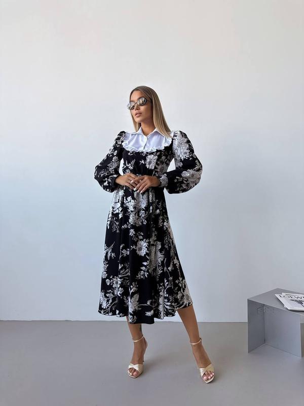 Платье миди #229/379 📍Тканина - софт 📍Размеры :42-44,46-48,50-52 Изящное платье миди с цветочным принтом Нежное и элегантное платье длины миди с изящным цветочным узором. Модель с легкими объемными рукавами на манжетах и акцентным белым воротником-рубашкой с декоративной рюшей, что добавляет образу изысканности. Поясная область с легкой сборкой подчеркивает талию, создавая женственный силуэт. Легкая и приятная к телу ткань обеспечивает комфорт в течение всего дня. Идеальный выбор для офиса, прогулок или особенных событий, когда хочется выглядеть стильно и непресечно. Размер 42–44 • Грудь: 86 см • Рукав: 70 см • Длина изделия: 116 см • Талия: 60–72 см Размер 46–48 • Грудь: 94 см • Рукав: 71 см • Длина изделия: 117 см • Талия: 68–80 см Размер 50–52 • Грудь: 102 см • Рукав: 72 см • Длина изделия: 118 см • Талия: 74–86 см