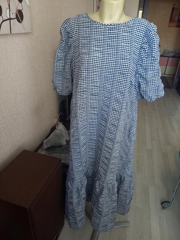 Красивое стильное платье из жатой черно- белой натуральной ткани в клеточку, в стиле бохо известного британского бренда Asos. Указан размер 16/44. Это 50-52-ой. Длина платья 119 см, в т.ч. рюша 39 см. ПОГ 54 см, далее от груди до низа платье расширяется. Бирка с составом обрезана, но на ощупь - хлопок.