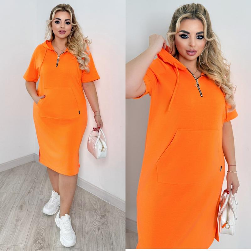 Сукня арт. nf. 3783 Тканина: двонитка Цвета: черный, оранж, зеленый, фиолетовый Размеры: 48-50, 52-54, 56-58, 60-62, 64-66 Стильное повседневное платье в спортивном стиле из мягкого трикотажа. Платье с капюшоном, в кулиску продеты шнурок из основного материала. Впереди короткая молния для удобного надевания. На передней полочке обработан карман "кенгуру". Внизу, по бокам, небольшие разрезы.