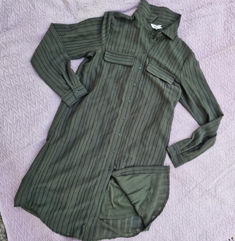 Платье-рубашка с длинным рукавом. идеальное состояние Цвет: Оливковый / хаки с тонкими вертикальными полосками. Фасон: Прямой, свободный крой, на пуговицах по всей длине. Длина: Меди (удлиненная спинка). Состав ткани: 100% полиэстер. Ткань легкая, струящаяся, на подкладе полуобхват плеч 38 см пол обхват груди 50 см длина рукава 60 см Длина платья 95 см