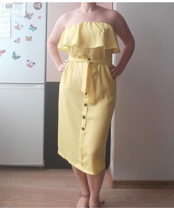 242. Платье новое, было без бирки. Гудзики декоративные. Есть карманы, пояс. Ткань напоминает креп шифон, не просвечивает. Полиэстер. Волан впереди дольше, чем по спинке. Размер по набору L. Ширина верху по резинці 42 см, тягнется до 50 см длина волана 16 см ПОГ 50 см ПОС 55 см длина 90 см. Обмену и возврат нет.