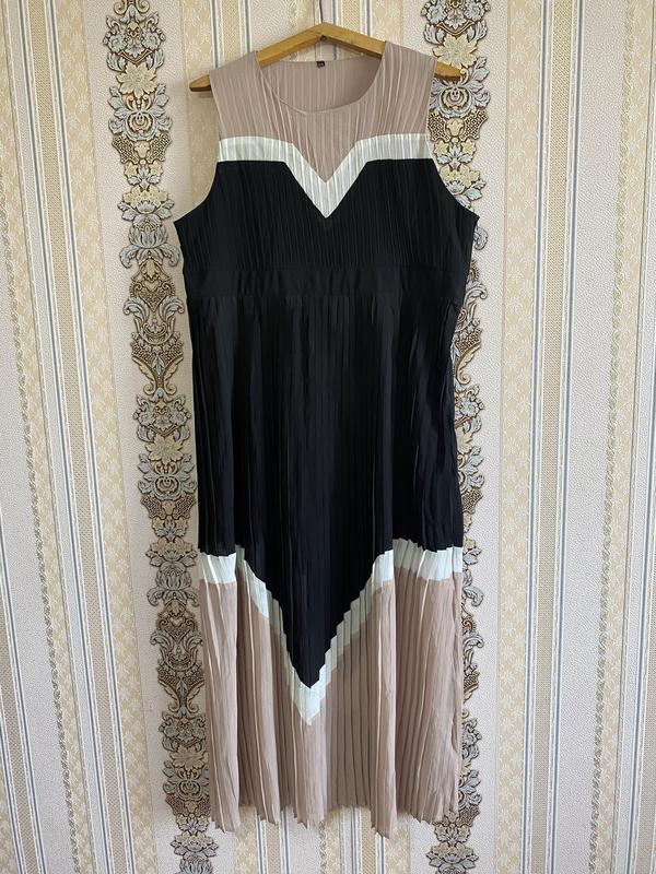 Стильна легка довга сукня, чорне з бежевим плаття міді батал, сукня в плісе