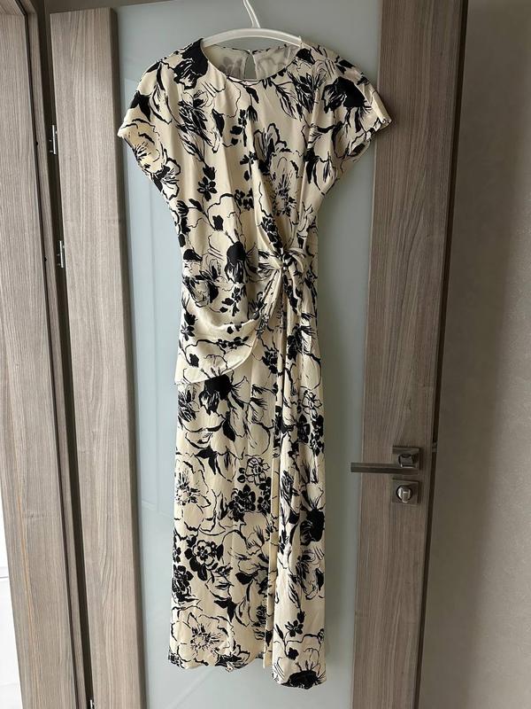 Платье с круглым воротником и короткими рукавами. Есть подкладка спереди есть узел на поясе, он декоративный. Сукня приталена. Размер М. К телу невероятно приятна. Тоненькое, поэтому подойдет на теплое время, как лето. Что касается длины, на мой рост 175 она была ниже колена. Цвет нежно молочный. Абсолютно нова, ні разу не носила. Продаю из-за того, что носить никуда.