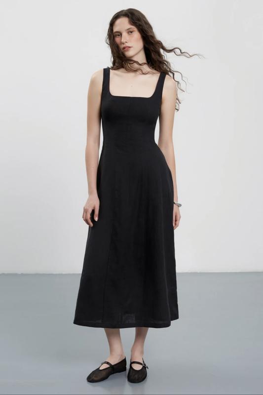 Чорний сарафан подовжене міді прилеглого силуету зі 100% льону. Сарафан має широкий заокруглений виріз декольте та поглиблений виріз по спинці. У моделі широкі шлейки, що приховають білизну. Талія сарафану підкреслена за рахунок повздовжніх рельєфів, що продовжуються до самого низу виробу та утворюють той самий Х-подібний силует. Спідниця сарфану розклешена по низу. Застібка-блискавка розміщена в шві спинки. Виріб виконаний з 100% натуральних матеріалів, тому чудово пасує для літнього сезону. Ідеальна модель для особливих моментів та на щодень. Довжина виробу: 128 см Розмір на моделі: 34
