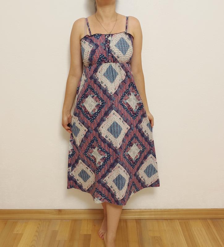 Легкая хлопковая миди-платье от качественного швейцарского бренда Charles Vögele. Выявилась, что это платье для девочки-подростка, но красиво сядет и на миниатюрную девушку. Изготовлена она из высококачественного 100% хлопка: тонкая, легкая, воздушная, очень мягкая, нежная и приятная к телу. Платье имеет актуальный крой: верх-резинка, завышенная линия талии, пышная юбочка, тонкие регулируемые бретели. Для данной вещи подобрали интересный принт в стиле пейчворк: обильные принты и их яркая комбинация создают своеобразную картину. Качественная, легкая, и главное комфортная вещь. Размер: на бирке указан рост 140 см, и ориентивно красиво сядет на XS-L. Замеры: ПОГ - 30-45 см (за счет резинки), ПОТ - 27-43 см (за счет резинки), ПОБ - 59 см, низ - 80 см, длина - 98 см, длина бретель - по 27 см. Состав: 100% хлопок. Параметры модели: ОГ - 84 см, ОТ - 68 см, ОБ - 96 см. Рост - 170 см.