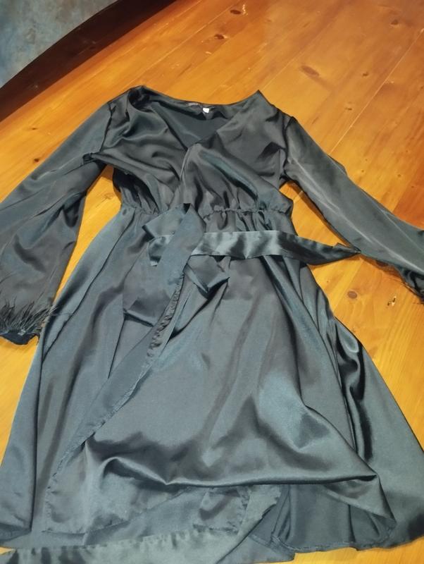 платье черное атлас с перьями на рукавах на запах размер s