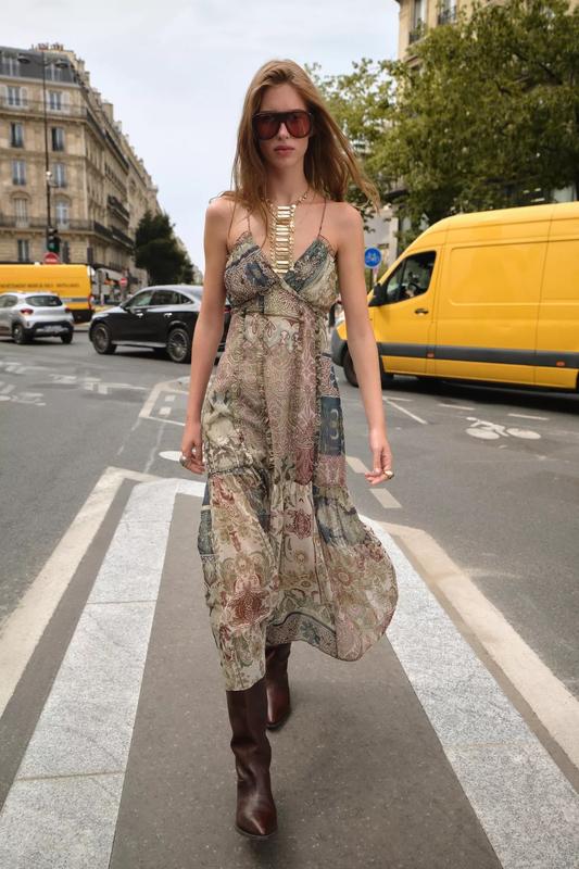 Платье с V-образным вырезом и тонкими бретелями, пересекающиеся на спине. Украшена воланами. Внутренняя подкладка. Боковая застежка на тайную молнию в шве.