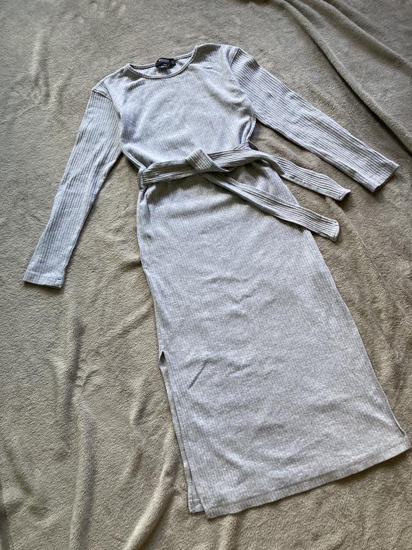 Сіра базова довга сукня міді в рубчик з довгими рукавами з поясом облягаюча по фігурі сукн...