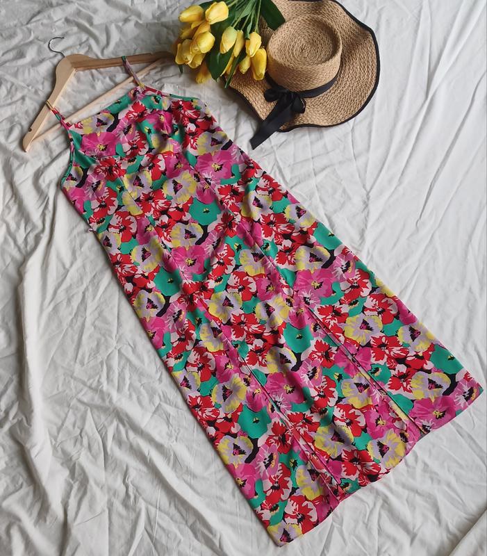 • ПОГ 45-46 • ПОТ 41 • ПОС 51-52 • ПО внизу 58 • Длина 119 • Длина резов 37 Без дефектов Состояние новой вещи Яркое цветочное платье Внизу разрезы Есть поясок из такой ткани как платье Сбоку потайная молния Без подкладки...не просвечивает Размер указан L 100% полиэстер
