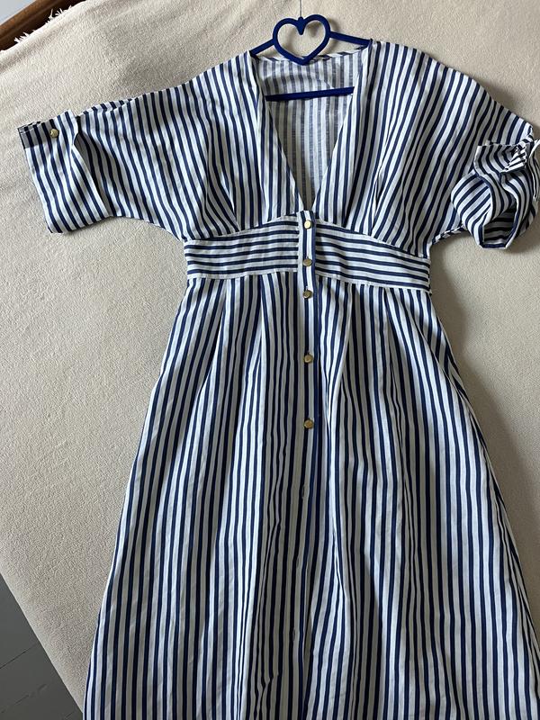 Сукня в розмірі L, на ґудзиках, є пояс, який завʼязується ззаду. Глибокий виріз, широкі рукава. Довжина сукні 125 см, талія 84 см. Сукня одягалася один раз на фотосесію.
