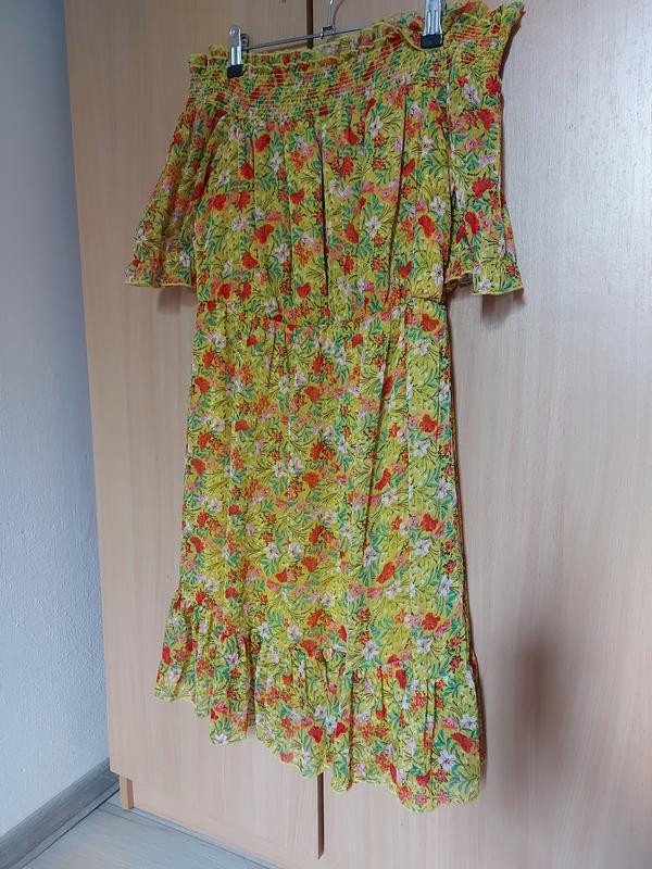 Легкое шифоновое платье на подкладке. Верх - легкие резинки, что дает возможность по желанию открыть или закрыть плечи, талия - также на резинке.