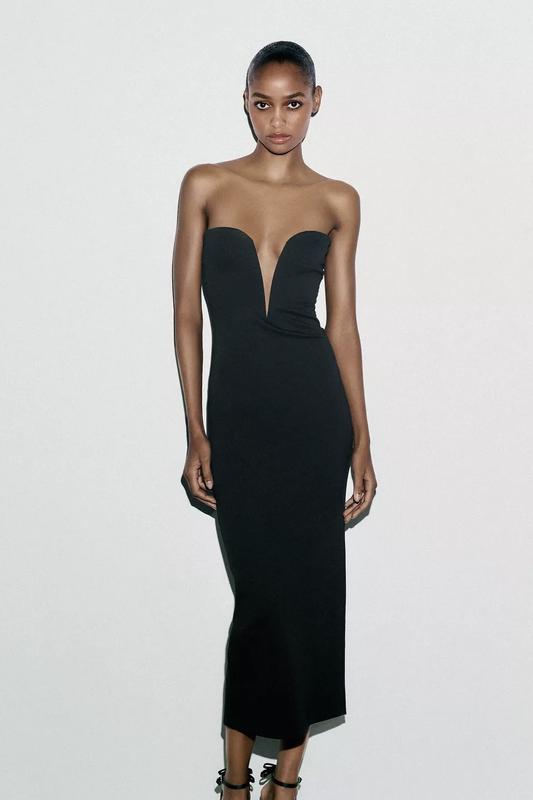 Приталенное платье миди. Вырез в форме сердца и открытые плечи. Боковая застежка на тайную молнию в шве.