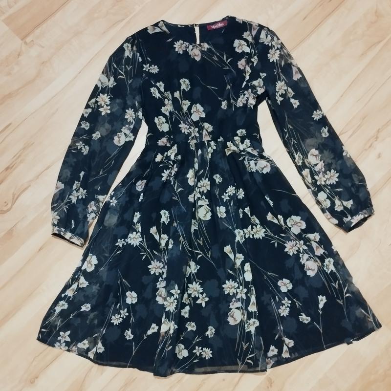 Платье цветочное с длинным рукавом, на подкладке, рукава прозрачные. Застежка сбоку-молния. Длина -98, ширина -50, талия-39, рукав -62 см