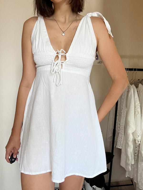 Біла сукня Zara з тонкої фактурної тканини. Розмір: S Стан: ідеальний Бірка зі складом зрізана, але на дотик тканина дуже схожа на льон. Легка та дихаюча, комфортна для літніх днів.