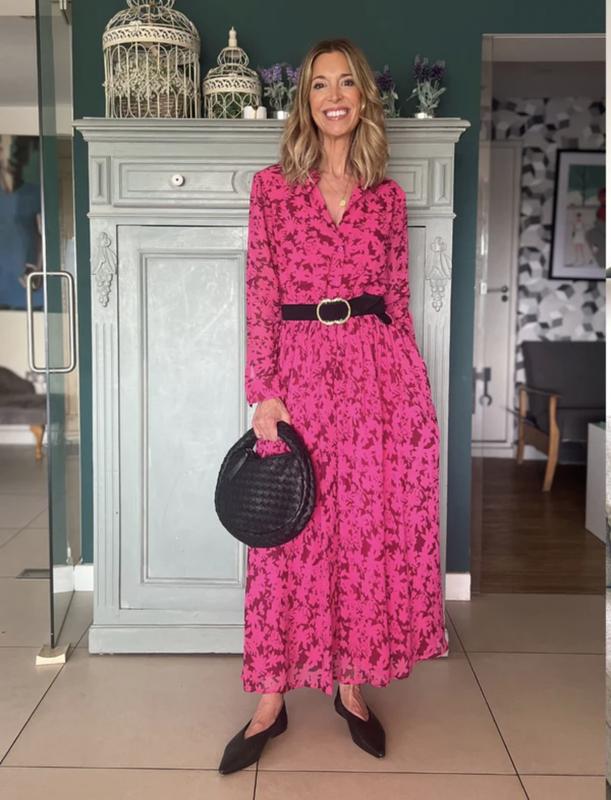 Сукня міді у квітковий принт. Сукня з натуральної тканини: креп шифон, підкладка:100% котон Сукня на довгий рукав, до талії защіпається на ґудзики, в талії є резинка, з боків є кишені. Підкладка довга, вільно лягає. Розмір 14 Довжина 125 см ШП 41 см Рукав 58 см ПОГ 54 см ПОТ 40 см + тягнеться резинка Стан нового