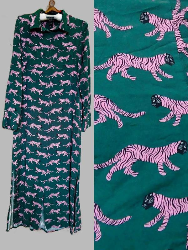 Миди платье asos xs на пуговицах 100% вискоза цвет зеленый принт розовый тигр monki