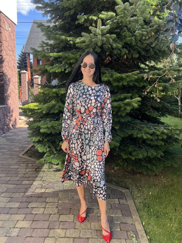 Шовкова сукня довжини міді вільного силуету-трапеції Тканина: шовк армані Крій: трапеція Розміри: 48,54 Довжина: 119 см Заміри: 48 - ОГ 110 ОТ 112 ОС 128 рукав 64 50 - ОГ 114 ОТ 116 ОС 132 рукав 64 52 - ОГ 118 ОТ 120 ОС 136 рукав 64 54 - ОГ 126 ОТ 128 ОС 144 рукав 64