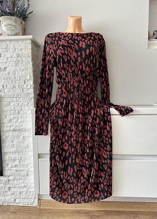 Сукня Zara жіноча, стильна та зручна. Виконана з еластичної тканини, що добре тягнеться, забезпечуючи комфорт у носінні. Модель чорного кольору з червоним абстрактно-анімалістичним принтом, має довгий рукав та круглий виріз горловини. Особливості: • Розмір: підходить на M–XL • Довжина: 118 см • Напівобхват грудей: 55 см • Талія на резинці (регулюється) • Напівобхват бедер: 58 см • Добре тягнеться Ідеальний варіант для повсякденного образу, роботи чи вечірніх прогулянок.