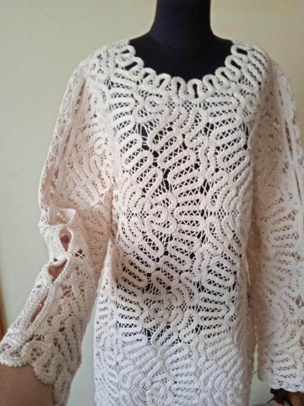 Длина 89 см. Полуобъем груди 54 см. Рукава посередине соединяются и образуются красивые как бы прорези. Рукава 65 см. Талія 50 см. Стегна 58 см. Оно отлично как будто вручную сделано. Достаточно тяжелая нить с интересным переплетением. Состав указан полиэстер но на ощупь и выглядит как хлопковая обьемная нить. Подкладки нет. Дефектов нет.Цвет как на втором фото.
