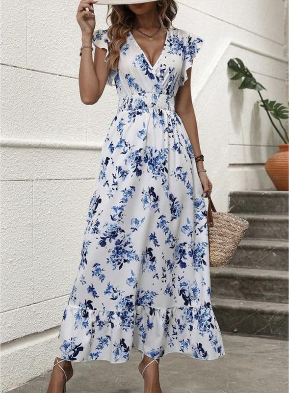 Шикарна сукня в квітковий принт, декольте на запах під грудьми резинка. Розмір 1XL орієнтуйтесь на заміри. Заміри: Під грудьми 38-58 см. Довжина 120 см.