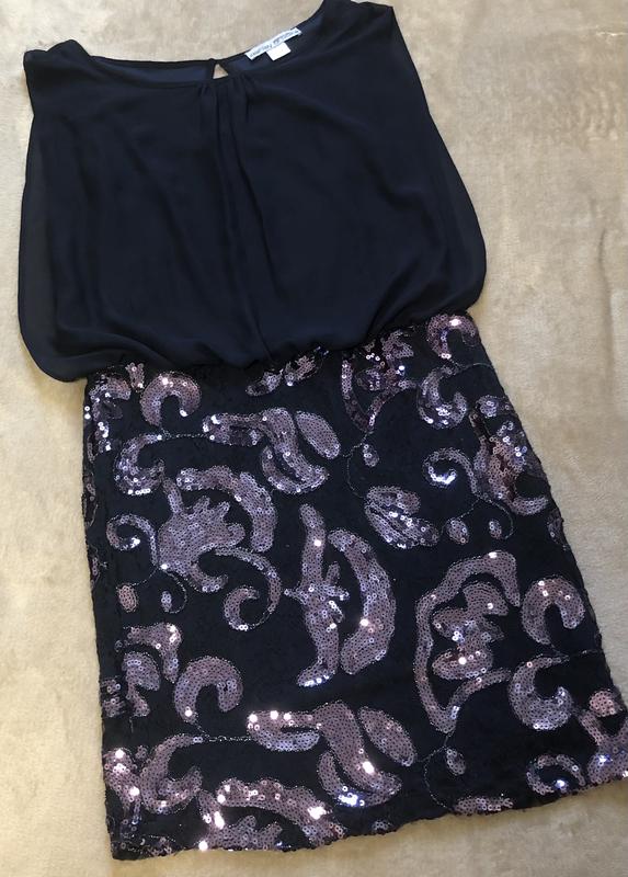 Вишукана жіноча сукня у відмінному стані. Гіпюровий низ прикрашений паєтками. Довжина від плеча 92 см.
