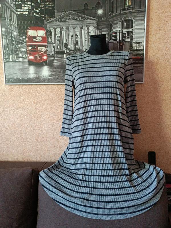 Платье женское в рубчик из серого трикотажа в черную полоску от Uniqlo. Подойдет на м-л (хорошо тянется). Замеры: ПОП-40, ПОГ-46, в бедрах свободно, длина-93, рукав-48.