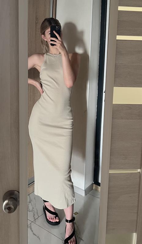Плаття по фігурі в рубчик, бежевого кольору розмір s, тягнеться, тому і підійде на інші розміри, вдягнено на s(зріст 175) маленький дефект на розрізі , див. останнє фото, інших дефектів немає бренд DeFacto