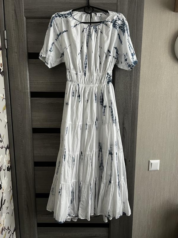 Сукня у чудовому стані. Підійде на розмір 46-48. Натуральна тканина, легка. Від талії донизу є підкладка. Ззаду завʼязується, тому можна регулювати, талія на гумці. Плечі 42 см Довжина 129 см Всі потрібні додаткові заміри зроблю.