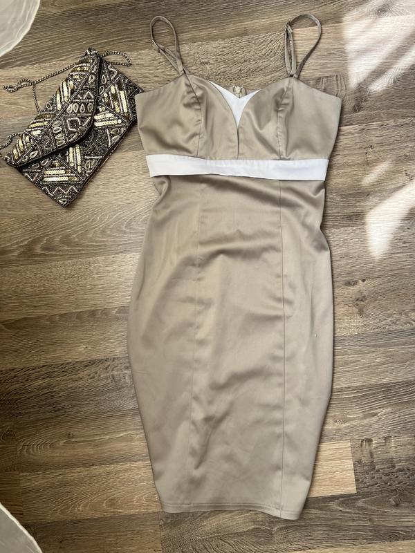 Бежева коктейльна сукня, є підкладка в грудях , на спині застібка, бретельки регулюються. Довжина 80 без бретелей, в грудях напів обхват 40, але тягнеться до обʼєму 88, талія напів обхват 32. Тканина тягнеться, є невеликий дефект на останньому фото, при носінні в очі не кидається
