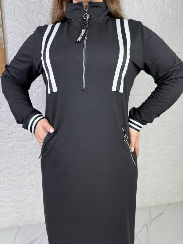 Платье Модель 1011VL Размеры: 46-48 (10), 50-52 (7), 58-60 (1) Ткань : двухнитка ( хорошего качества) Цвет: черный Удлиненное платье спор шик интересного кроя: на груди широкие лампасы, делают визуально утонченной фигуру и уменьшают силуэт. По низу платья и на рукавах также лампасы, на груди молния с «висульной» (карабин с надписью), по бокам карманы на молнии, по низу по бокам молния. Параметры модели-нормы ОГ96, ОТ74, ОБ104, рост 170см, на ней одет 46-48; параметры модели-балталл ОГ108, ОТ86, ОБ110, рост 165см, на ней размер 50-52. Замеры изделия: Размер 46-48 Объем груди 110 Объем талии 98 Объем бёдер 110 Рукав 62 Бицепс 34 Плечи 41 Длина по спинке 111 Размер 50-52 Объем груди 116 Объем талии 106 Обʼєм стегон 116 Рукав 63 Бицепс 36 Плечи 43 Длина по спинке 112 Размер 54-56 Объем груди 122 Объем талии 116 Объем бёдер 122 Рукав 63 Бицепс 38 Плечи 44 Длина по спинке 113 Размер 58-60 Объем груди 130 Объем талии 124 Объем бёдер 130 Рукав 65 Бицепс 40 Плечи 46 Длина по спинке 114 Размер 62-64 Объем груди 136 Объем талии 134 Обʼєм стегон 140 Рукав 67 Бицепс 42 Плечи 48 Длина по спинке 115