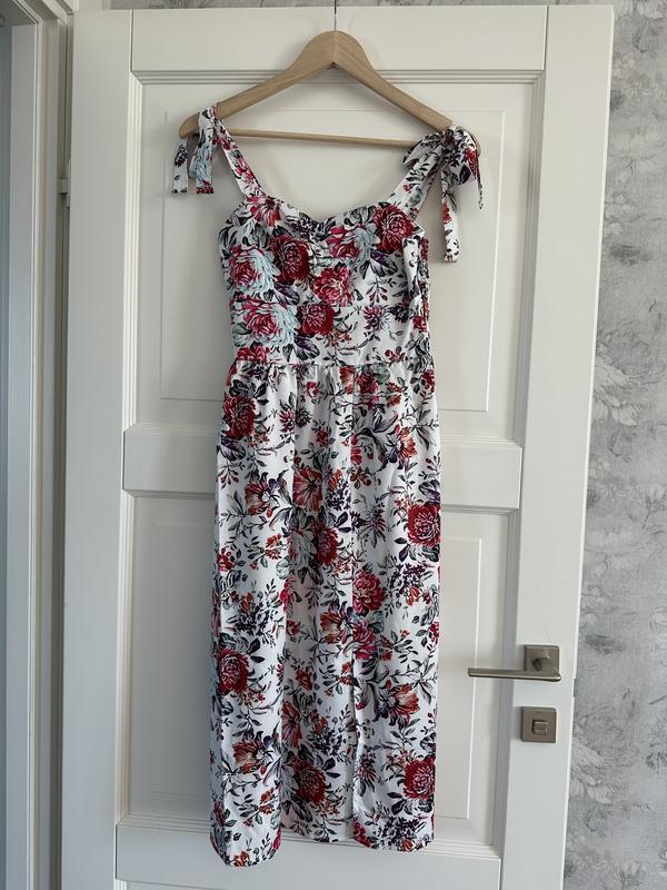 Гарна сукня з квітковим принтом, з вирізом на ніжці, на зріст 165 см йде трошки нижче коліна. Ззаду на спинці зверху є резиночка, найкраще буде на розмір С/М Склад тканини, на жаль, невідомий, ймовірно поліестер. Сукня нова, не підійшов розмір. До неї в комплекті йде легка біла кофтинка.