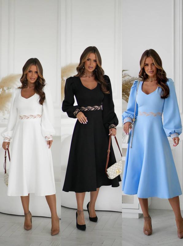 СУКНЯЯ С ВЫШИВКОЙ НА ТАЛИИ И МАНЖЕТАХ Модель 7559 Размер S (42),М (44),L (46),XL (48) Тканина: костюмка + вишивка Длина платья : 115см Рукава: 65 см Кольори: черный, молочный, голубой __________________ Изысканное платье длины миди с контрастной вышивкой на талии и манжетах. Глубокий V-образный вырез визуально удлиняет шею и добавляет образу нотку романтичности, а длинные рукава с легким объемом придают мягкость и плавность линиям. Контрастная вышивка на талии и манжетах подчеркивает внимание к деталям и создает изысканный акцент. Идеальный выбор для тех, кто ценит классику в современном исполнении.