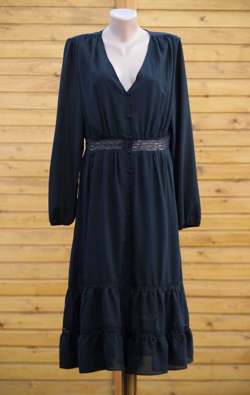 Красивое черное платье миди. Стан идеален. Состояние новой. Состав ткани: полиестер. Размер указан 42. Ориентировочно подойдет на размер М - Л, но лучше смотрите на замеры. Замеры: От плеча до плеча - 38 см Полуобхват груди (ширина под подмышками) – 51 см Полуобхват талии (в самой узкой части талии) – 41 см Длина рукава от плеча - 64 см Полуобхват бедер – свободно. Длина - 114 см