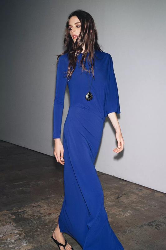 Довга сукня з круглим вирізом. Довгий рукав і рукав у вигляді накидки. Об’ємна деталь збоку. Прямий поділ. Застібка на спині з вирізом і ґудзиком. БЛАКИТНИЙ | 5039/471/400