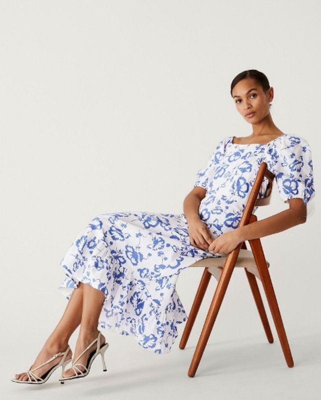 Льняное миди платье в цветочный принт Marks&Spencer Короткие объемные рукава. Отрезная немного завышенная талия. Грудь по спинке идет на резинке. По низу волан. С боку идет на молнии. Размер 12 Длина от плеча 116 // 38 пог 45-52 пот 40-43 поб 55