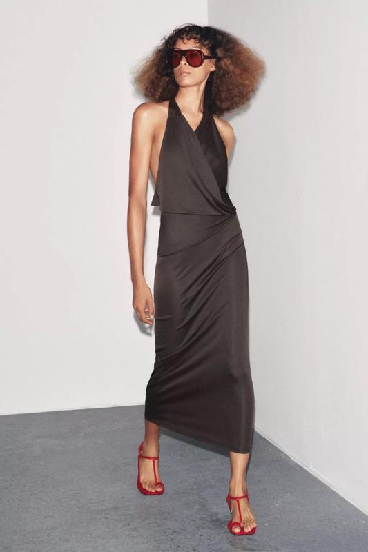 Довга сукня з коміром-петлею та вільним вирізом. Відкриті плечі. Деталь із бічними складками. Тональна внутрішня підкладка. Бічна застібка на приховану блискавку та застібка на ґудзики ззаду. ТЕМНО-КОРИЧНЕВИЙ | 5644/821/716