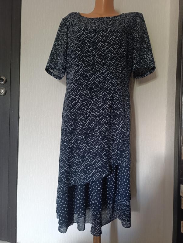 Платье темно синего цвета с белым узором., приталенного силуэта, на спинке небольшие пояски, застежка молния до талии. Длина по центру спинки 105cм, ПОГ 53см, ПОС 58см, длина рукава 28см, ширина рукава по низу 17см.