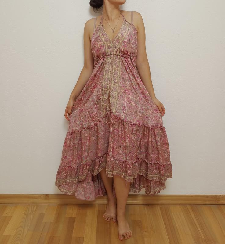 Еще одна невесомая шелковая меди-платье от качественного бренда Bold & Beautiful. В составе указан "art silk": это искусственная ткань из целлюлозного сырья. Простыми словами это вискозный шелк, но особенность его, что он максимально напоминает натуральный. Ткань легкая, тонкая, воздушная, невесомая, при этом плотная и прочная, с глянцевым финишем. Платье имеет актуальный крой: верх-лиф, завышенная линия талии, пышная юбочка, открытая спинка и плечи. Для данной вещи подобрали пастельный розовый оттенок и соединили его с принтом "пейсли". Еще одна легкость, которую не захочется снимать. На ресейл-платформы подобные платья перепродают в среднем по 50$ - https:/********************************************** Размер: фактически one size, красиво сядет на XS-XL, все регулируется завязками. Замеры: ПОГ – 50 см, ПОТ – 49 см, ПОБ – 102 см длина – 102 см, длина завязок – по 65 см. Состав: 100% арт-шовк. Параметры модели: ОГ - 84 см, ОТ - 68 см, ОБ - 96 см. Рост - 170 см.
