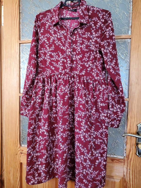 Бордовое миди платье в белые цветочки от new look на длинный рукав с пуговицами