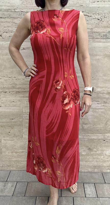 Малинова сонячна сукня з квітковим принтом з віскозного полотна. Зав'язується ззаду на талії . По низу чотири розрізи. Підходить на розмір L (42) В ідеальному стані. Дуже легенька і приємна на дотик.