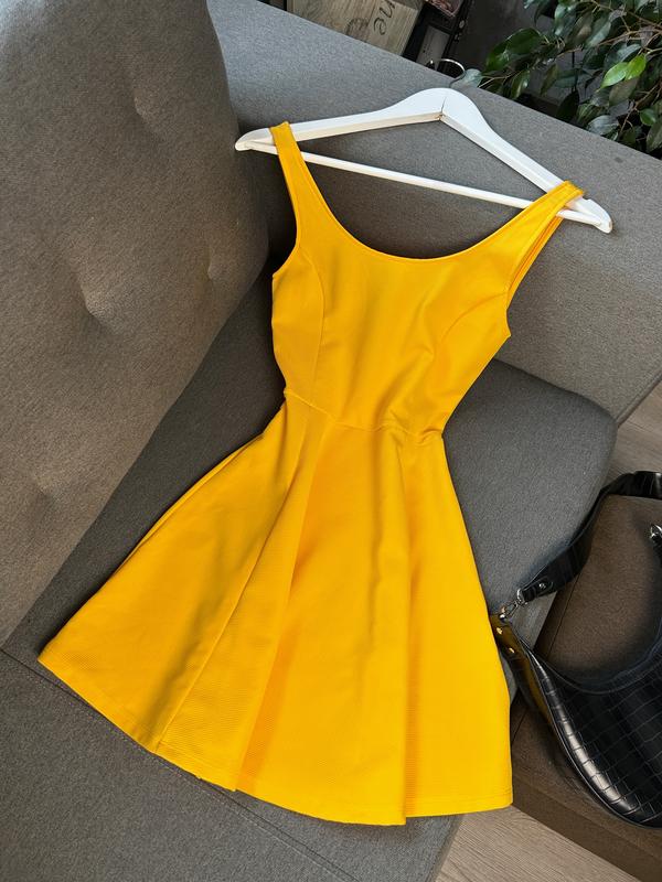 Гарна сукня насиченого жовтого кольору. Гарно тримає форму. Спинка напів відкрита. Довжина 82см. Пог 38-( тягнеться 48см). Пот 32( тягнеться до 37см.) Пос 60см( широко, сяде по фігурі).