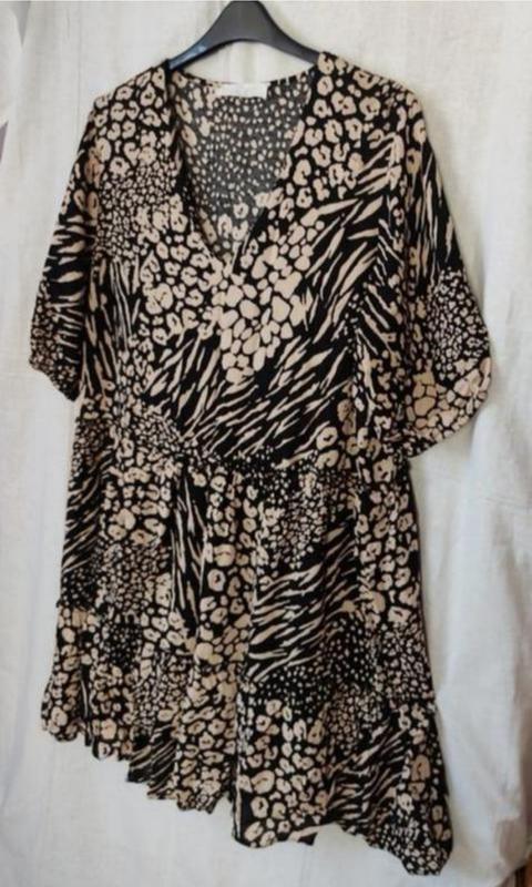 Красивое платье черно-бежевого цвета с абстрактным принтом; талия отрезная с двумя широкими оборками которые присборены сверху к холсту и образуют тоненькие оборки по шву; рукав короткий широкий, присборенный на резинке; вырез V - похожий; состав 100% натуральное волокно; ткань в виде штапеля; известного ирландского бренда Primark Замеры: длина -96, от плеча до талии-44. 5; рукав-33; пог-66; пот-61. Размер 79-20(54). Изделие очень качественное. Рекомендуемая цена Шафы 400 грн.