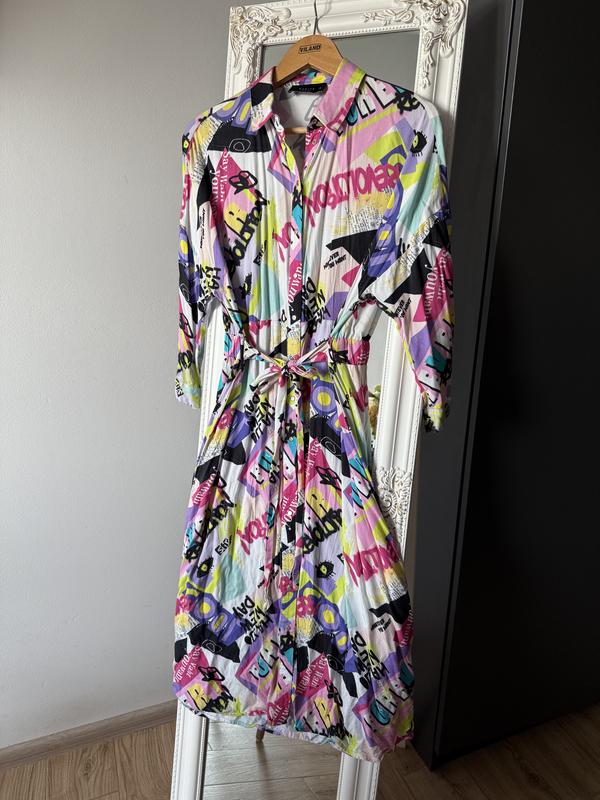 яскрава сукня-халат від мохіто на спині резинка, має пояс застібки кнопки на хс-с довжина нижче коліна, рукав 3/4 заміри: довжина 113см рукав 45см святкова і яскрава, водночас скромна і витримана ідеально на корпоратив