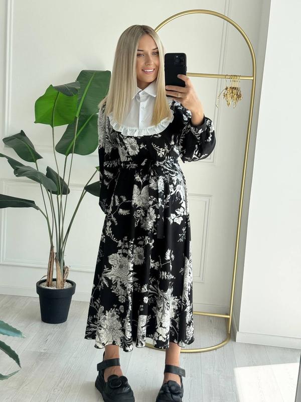 🌻Нежное и элегантное платье длины миди с изящным цветочным узором. Модель с легкими объемными рукавами на манжетах и акцентным белым воротником-рубашкой с декоративной рюшей, что добавляет образу изысканности. Поясная область с легкой сборкой подчеркивает талию, создавая женственный силуэт. Легкая и приятная к телу ткань обеспечивает комфорт в течение всего дня. 📍Тканина - софт 📍Размеры :42-44,46-48,50-52 ✅Цвет:черный, бежевый Воротник 42–44 • Грудь: 94 см • Рукав: 70 см • Длина изделия: 116 см • Талия: 60–72 см Размір 46–48 • Грудь: 102 см • Рукав: 71 см • Длина изделия: 117 см • Талия: 68–80 см Размір 50–52 • Грудь: 108 см • Рукав: 72 см • Длина изделия : 118 см • Талия: 74–86 см ✅Цена:1550 грн💶 Арт Имм379 ‼️Отправка 1-4дны