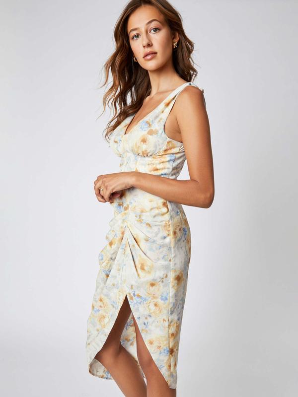 Платье-миди в цветочный принт. Нежные пастельные цвета. Корсетные косточки, драпировка складки на юбке. В наличии размер М. Все замеры по запросу. Стан идеален.