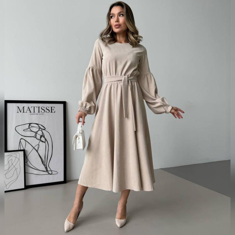 Платье женское миди вельветовое приталенное а силуэт с поясом и рукавами фонариками стильн...