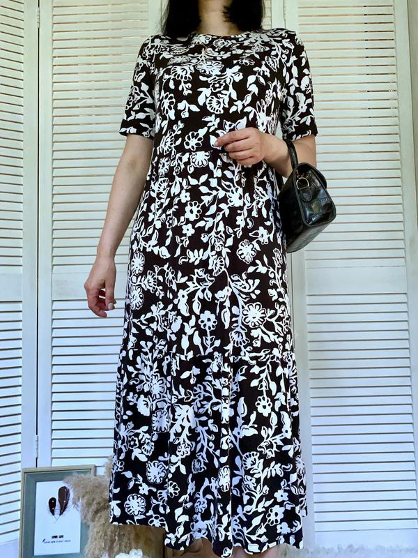 Чорно-біла сукня міді в квіти M&S, р-р 12 або на 10 Стан відмінний ПОГ 48-57, ПОТ 43, ПОС 56-63, довжина 118, рукав 23 95 віскоза, 5 ЕЛАСТАН