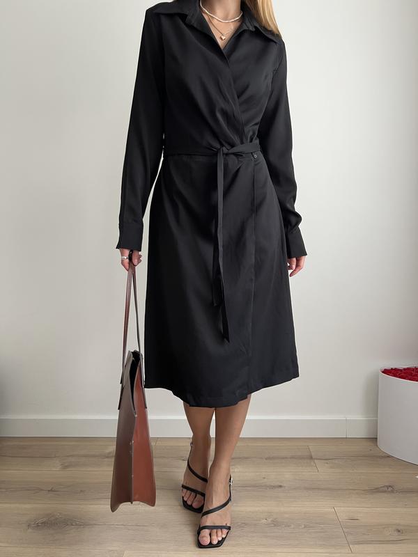Чорна міді сукня на затин A m a r a n t o Цупка тканина, є поясок, манжети на ґудзиках Розмір іде на С-М Заміри: поб грудей ~ 45см (вільно), талії 37см, стегон 55см, довжина 106см Склад: поліестр, еластан Стан ідеальний Ціна 649 грн Мої параметри: 81-62-90, ріст 163 см